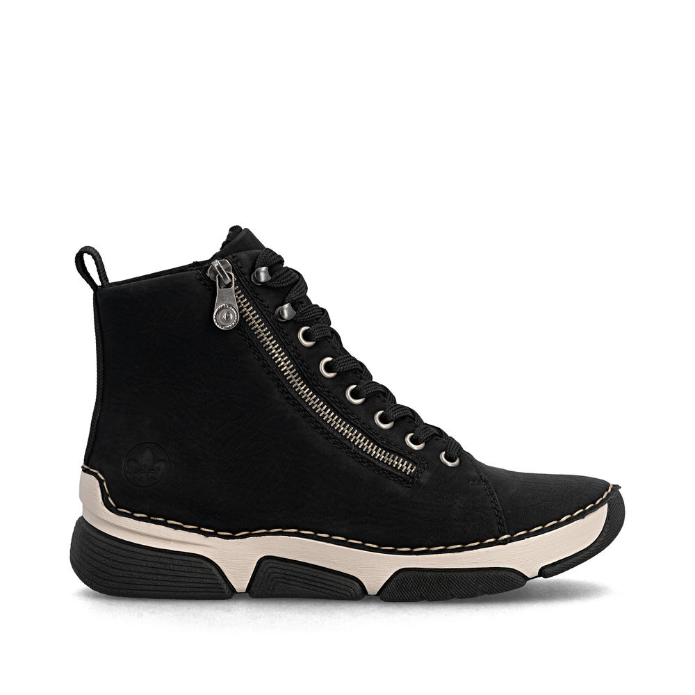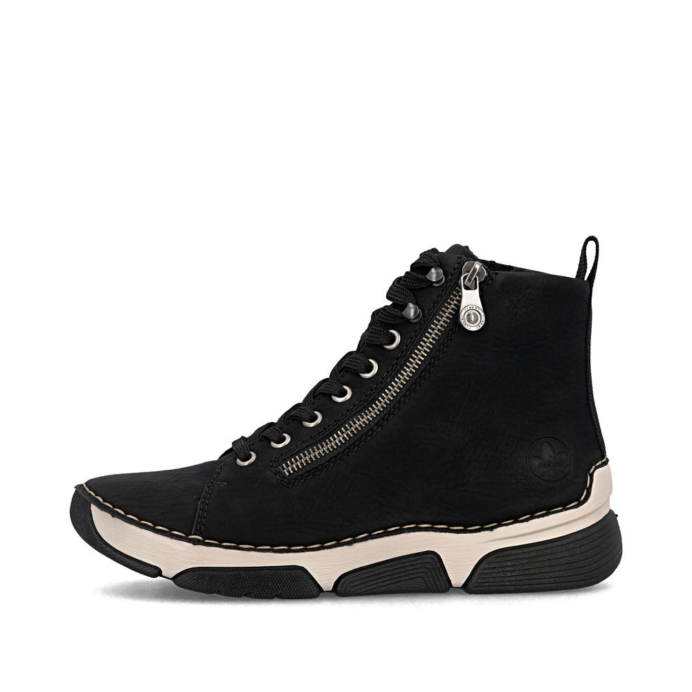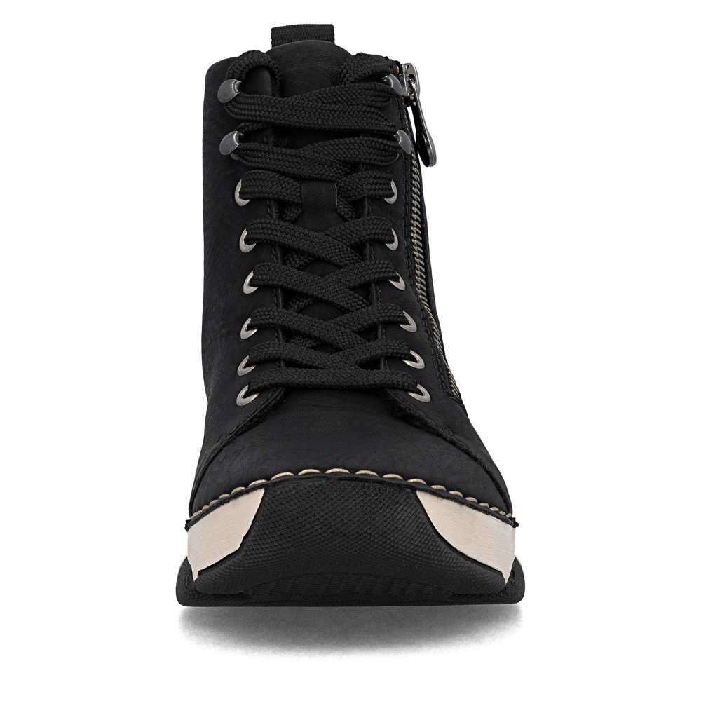Dámske zateplené topánky z kolekcie značky Rieker. Určite si ich zamilujete vďaka ich pohodlnosti a mäkkosti. Priestorný tvar špičky, mäkký a hrejivý materiál vás zahalí do pohodlia v mrazivých dňoch. Pre ľahké obutie je zapracovaný funkčný zips a šnúrky na šnurovanie. Vďaka pevnému šnurovaniu tento model topánok pevne priľne k nohe po celej dĺžke. Viazanie zároveň esteticky dotvára zvršok obuvi v klasickom štýle. Pre všetkých, ktorí sa chcú v topánkach cítiť pohodlne a štýlovo. Vďaka unikátnym vlastnostiam podošvy zažijete jedinečný pocit ľahkosti pri chôdzi. Ak denne trávite na nohách viac času tak značka Rieker je skutočne tou pravou voľbou pre Vás. Ide doslova o vychádzkovú obuv ktorá vydrží v plnej kvalite naozaj veľmi dlhý čas.