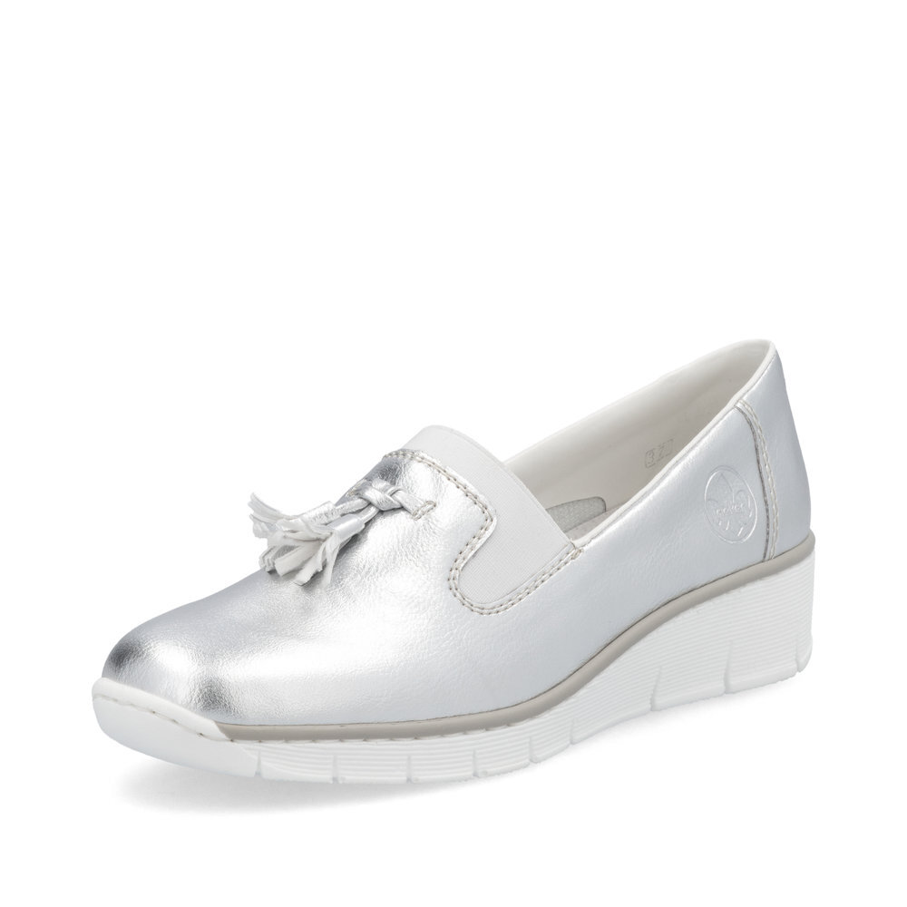 Dámske mokasíny z kolekcie značky Rieker. Jednoduché obúvanie a prispôsobenie sa podľa požiadaviek zaistí všitá pružná vsadka v oblasti priehlavku. Mäkká stielka. Sú skvelým doplnením každého elegantného ale aj ležérneho outfitu. Podošva dokonale dopĺňa dizajn, postará sa o Vaše pohodlie na každom kroku, tlmí nárazy a otrasy. Vďaka jej vlastnostiam je táto obuv vyhľadávaná všetkými, ktorí musia počas dňa dlho stáť a chodiť. Ak denne trávite na nohách viac času tak značka Rieker je skutočne tou pravou voľbou pre Vás. Ide doslova o vychádzkovú obuv ktorá vydrží v plnej kvalite naozaj veľmi dlhý čas. Po vyčerpávajúcom a náročnom dni sa budú Vaše nohy cítiť svieže a oddýchnuté a to najmä vďaka ľahkým materiálom.