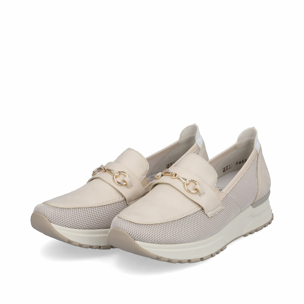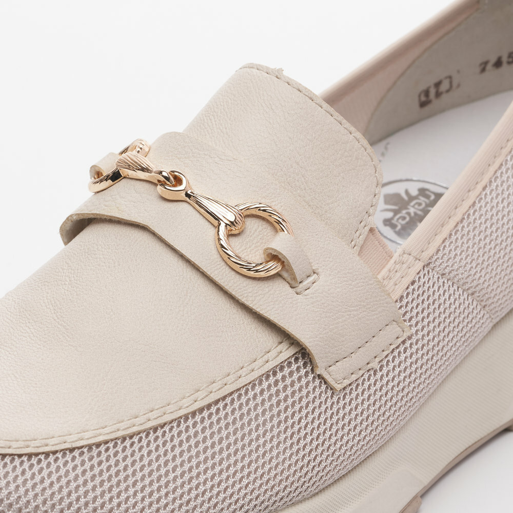 Dámske mokasíny z kolekcie Rieker. Jednoduché obúvanie a prispôsobenie sa podľa požiadaviek zaistia všité pružné vsadky v oblasti priehlavku. Mäkká stielka, ktorá podporí príjemný došľap, nadväzuje na zabrúsenú pätnú časť. Pružná a robustná podošva dokonale dopĺňa športový dizajn, postará sa o Vaše pohodlie na každom kroku, tlmí nárazy a otrasy. Vďaka jej vlastnostiam je táto obuv vyhľadávaná všetkými, ktorí musia počas dňa dlho stáť a chodiť. Ak denne trávite na nohách viac času tak značka Rieker je skutočne tou pravou voľbou pre Vás. Ide doslova o vychádzkovú obuv ktorá vydrží v plnej kvalite naozaj veľmi dlhý čas. Po vyčerpávajúcom a náročnom dni sa budú Vaše nohy cítiť svieže a oddýchnuté a to najmä vďaka ľahkým materiálom.