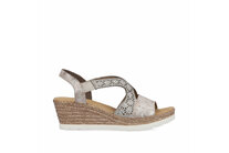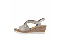 Dámske remienkové sandále z kolekcie značky Rieker na klinovom podpätku. Pohodlná výška klinu. Topánky Vám zabezpečia maximálny komfort pri celodennom nosení. Komfortné a praktické sandále sú v kombinácii imitácie kože a elastického materiálu - gumičiek. Tieto popruhy sa prispôsobia a sandále sú tak pevné a stabilné na nohe. Pre všetkých, ktorí sa chcú v topánkach cítiť pohodlne a štýlovo. Pružná a robustná podošva dokonale dopĺňa dizajn, postará sa o Vaše pohodlie na každom kroku, tlmí nárazy a otrasy. Ak denne trávite na nohách viac času tak značka Rieker je skutočne tou pravou voľbou pre Vás. Ide doslova o vychádzkovú obuv ktorá vydrží v plnej kvalite naozaj veľmi dlhý čas. Po vyčerpávajúcom a náročnom dni sa budú Vaše nohy cítiť svieže a oddýchnuté a to najmä vďaka ľahkým materiálom a konštrukcii.