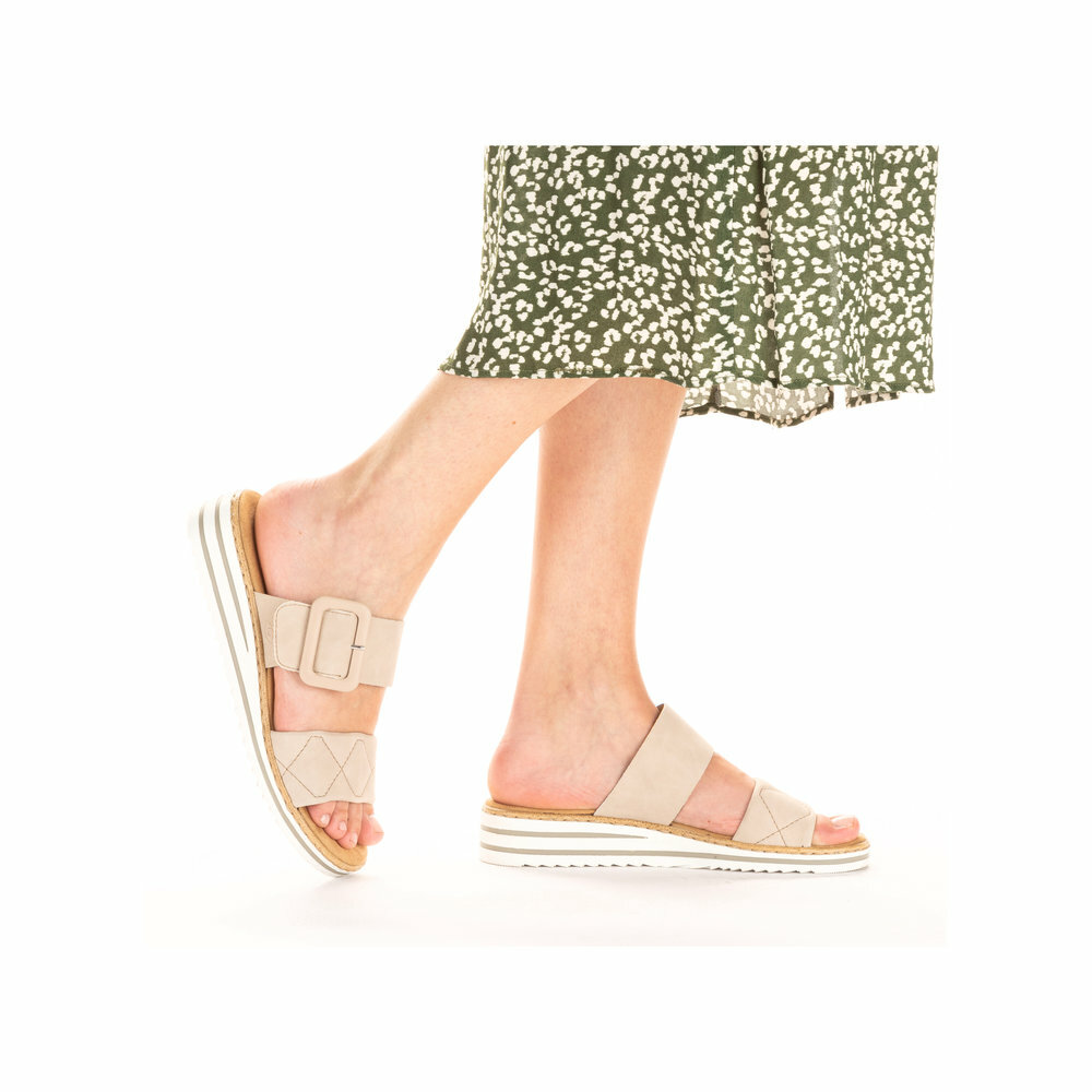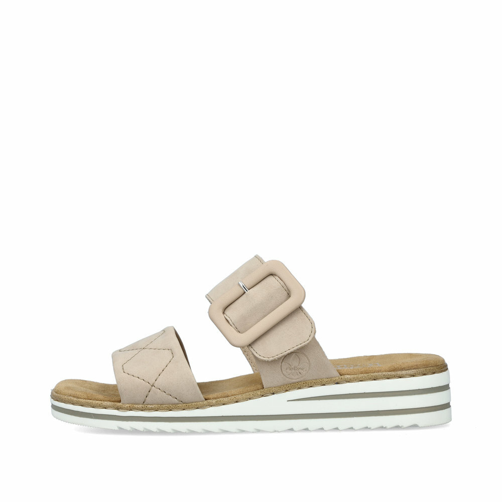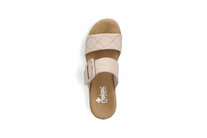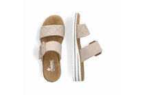 Dámske remienkové šľapky z kolekcie značky Rieker na klinovom podpätku, platforme. Komfortný model, ktorý počas letných dní zaiste využijete. S individuálne nastaviteľnými remienkami. Topánky Vám zabezpečia maximálny komfort pri celodennom nosení. Optimálna, pohodlná výška klinu. Pružná a robustná platforma dokonale dopĺňa dizajn, postará sa o Vaše pohodlie na každom kroku, tlmí nárazy a otrasy. Vďaka unikátnym vlastnostiam podošvy zažijete jedinečný pocit ľahkosti pri chôdzi. Ak denne trávite na nohách viac času tak značka Rieker je skutočne tou pravou voľbou pre Vás. Ide doslova o vychádzkovú obuv ktorá vydrží v plnej kvalite naozaj veľmi dlhý čas. Po vyčerpávajúcom a náročnom dni sa budú Vaše nohy cítiť svieže a oddýchnuté a to najmä vďaka ľahkým materiálom a konštrukcii.