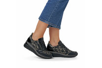 Dámske tenisky z kolekcie značky Remonte - Rieker. Pohodlne a štýlovo, tak sa budete cítiť v tomto modeli topánok. Príjemne mäkká stielka, ohybná podošva s optimálnou výškou klinu. Bočné zapínanie na zips pre jednoduché obutie a šnurovaním pre jednoduché správne nastavenie potrebnej šírky. Vďaka pevnému šnurovaniu tento model topánok pevne priľne k nohe po celej dĺžke. Viazanie zároveň esteticky dotvára zvršok obuvi v klasickom štýle. Pružná a robustná podošva dokonale dopĺňa športový dizajn, postará sa o Vaše pohodlie na každom kroku, tlmí nárazy a otrasy. Mäkká stielka, ktorá podporí príjemný došľap, nadväzuje na zabrúsenú pätnú časť. Vďaka jej vlastnostiam je táto obuv vyhľadávaná všetkými, ktorí musia počas dňa dlho stáť a chodiť. Po vyčerpávajúcom a náročnom dni sa budú Vaše nohy cítiť svieže a oddýchnuté a to najmä vďaka ľahkým materiálom.