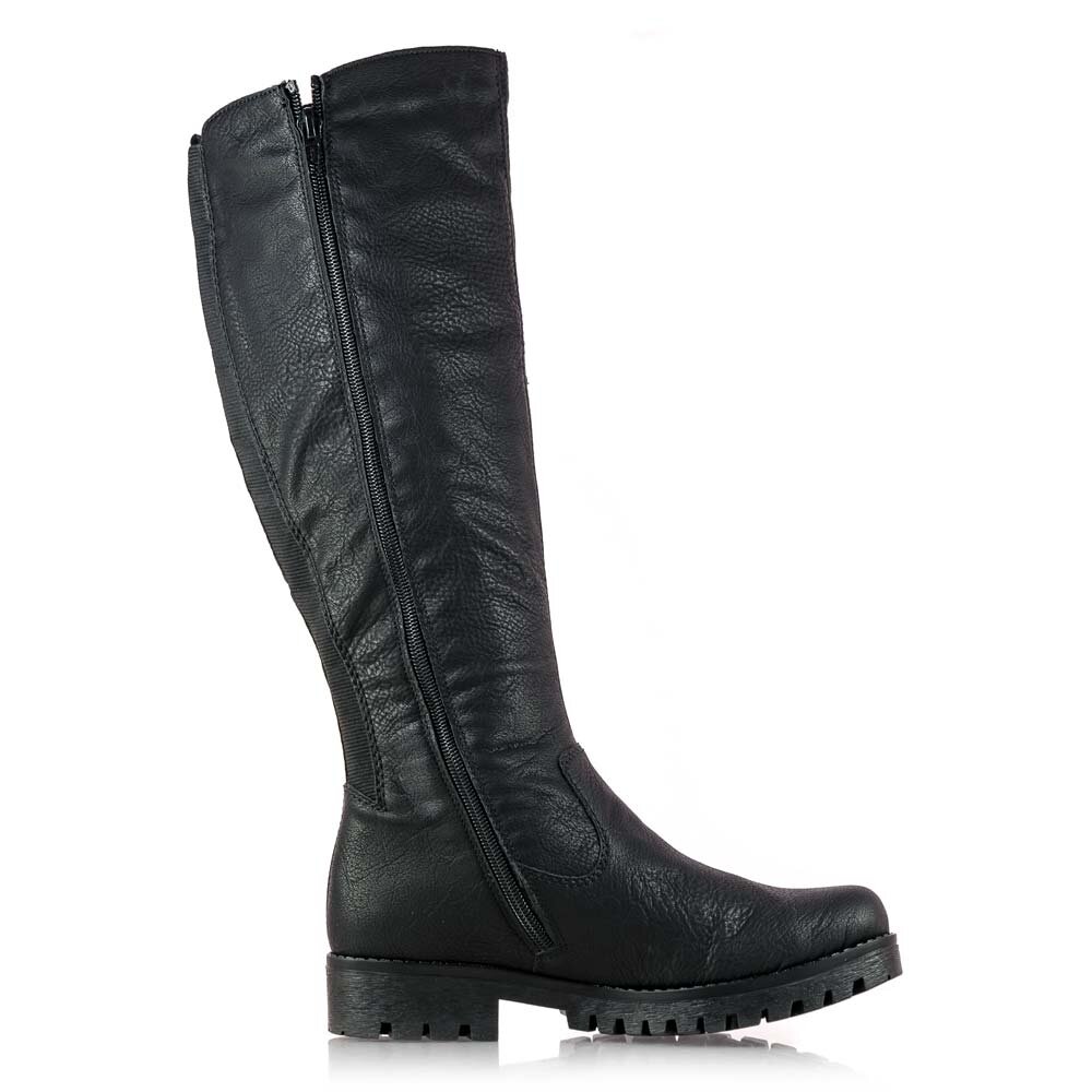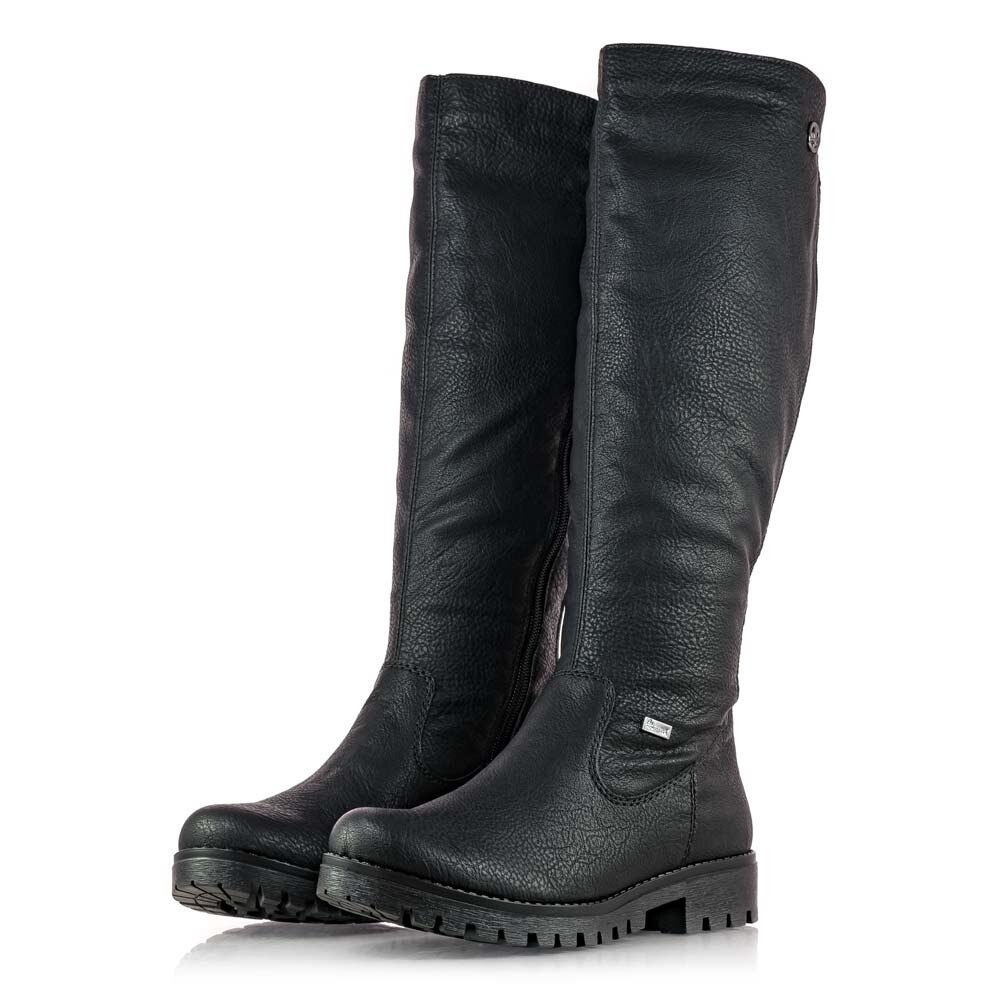 Dámske vysoké čižmy z kolekcie Rieker. Čižmy sú na hrubej podrážke. Vyrobené sú zo syntetickej kože. Strih Vario - na hornom okraji na zadnej strane sú všité dve pružné vsadky, čo umožňuje prispôsobenie sa lýtku podľa potreby. Sú zateplené podšívkou zo strižnej ovčej vlny a vlepenou zateplenou filcovou stielkou. Zapínanie obuvi je na zips na vnútornej strane. Obuv je vybavená membránou Rieker TEX - je výrobcom deklarovaná ako "obuv do každého počasia" - vodeodolnosť, výborná ochrana proti chladu, pri súčasnom zachovaní priedušnosti obuvi a pohodlie pri nosení. Výška čižmy po lýtku od päty je cca 39 cm, obvod lýtka je cca 36 - 40 cm. Pohodlná, ľahká konštrukcia s mäkkou stielkou zaistí príjemnú chôdzu, rovnako ako aj ohybná podošva. Z kolekcie Antistress. Protistresový systém znamená pohodlie pri každom kroku vďaka ľahkej, flexibilnej podrážke.