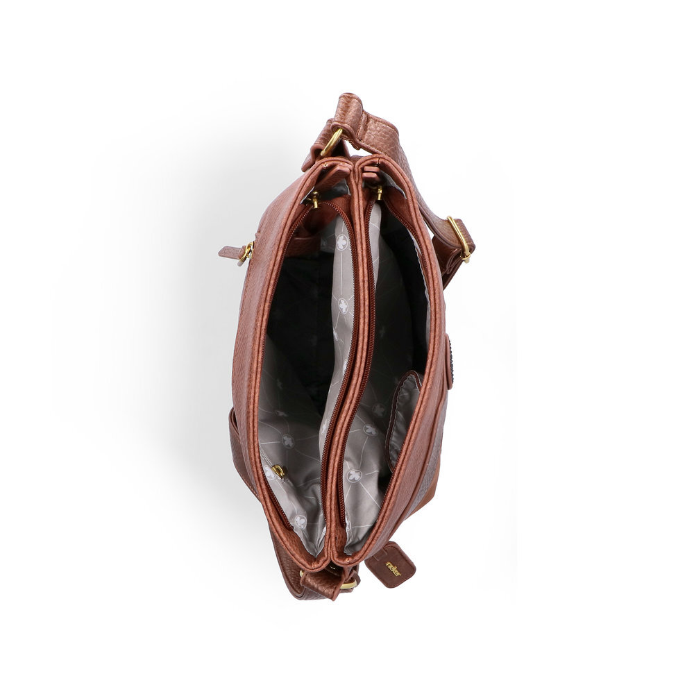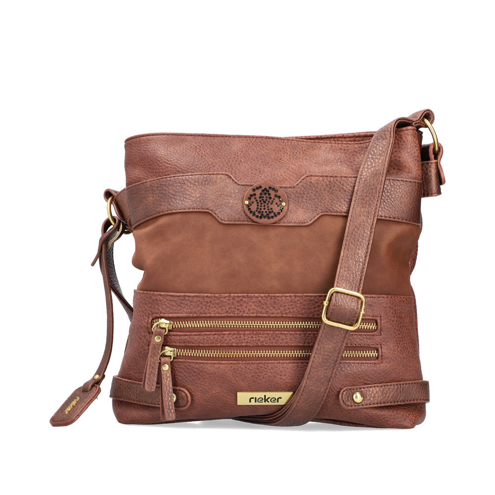 Dámska crossbody, kabelka z kolekcie značky Rieker. Zaujme Vás príjemnou kombináciou hnedých odtieňov, ktorú oživuje logo značky a elegantná aplikácia s trblietavými kamienkami. Prakticky členený hlavný priestor je rozdelený na dve samostatné časti uzatvárateľné zipsom. V jednej časti nájdete malé vrecko, v druhej dve priehradky na drobnosti. Nechýbajú ani tri ďalšie vrecká na zips – dve na prednej a jedno na zadnej strane, ktoré ponúkajú rýchly prístup k najčastejšie používaným veciam. Nastaviteľný dlhý popruh, ktorý nie je možné odopnúť, umožňuje pohodlné nosenie cez plece alebo cez telo. Rozmery cca V 28 cm x Š 28 cm x H 5,5 cm, kabelka je delená, má dĺžkovo nastaviteľný popruh, ktorý nie je možné odopnúť. Maximálna dĺžka nastaviteľného popruhu je cca 120 cm.