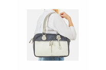 Priestranná a štýlová dámska shopper kabelka z kolekcie značky Rieker. Kabelka stredného strihu - formát A4 sa nezmestí, vyrobená je z poddajnej štruktúrovanej syntetiky a syntetiky s jemnou vzorkou, tmavo modrá a biela farba so šedými doplnkami, kovanie v striebornej farbe, na prednej strane dve zipsové vrecká, odopínateľný prívesok s logom značky, zhora uzatváranie na dve zipsové vrecká. Vnútorná výbava, vonkajšie vrecko je obojstranne polstrované - vhodné pre notebook či tablet, hlavné vrecko obsahuje 1x zipsové vrecko na cennosti, 2x otvorené vrecko na mobil, kľúče a pod. Madlá na rameno alebo do ruky (stredová vzdialenosť od hrany kabelky je cca 19 cm), odopínateľný ramenný popruh s dĺžkovou reguláciou 75-140 cm, rozmery cca šírka 34 cm, výška 24 cm, dno má hĺbku 12 cm.