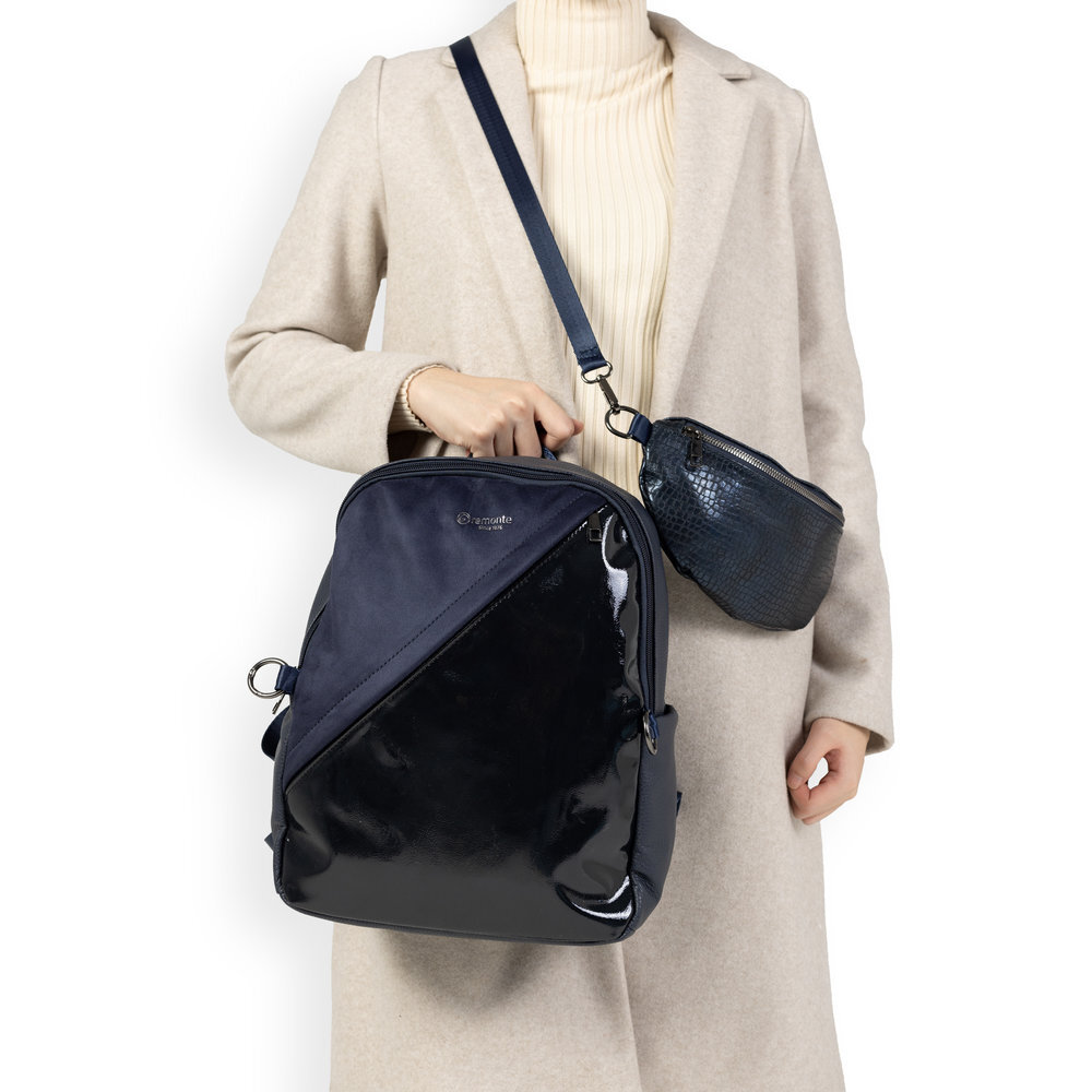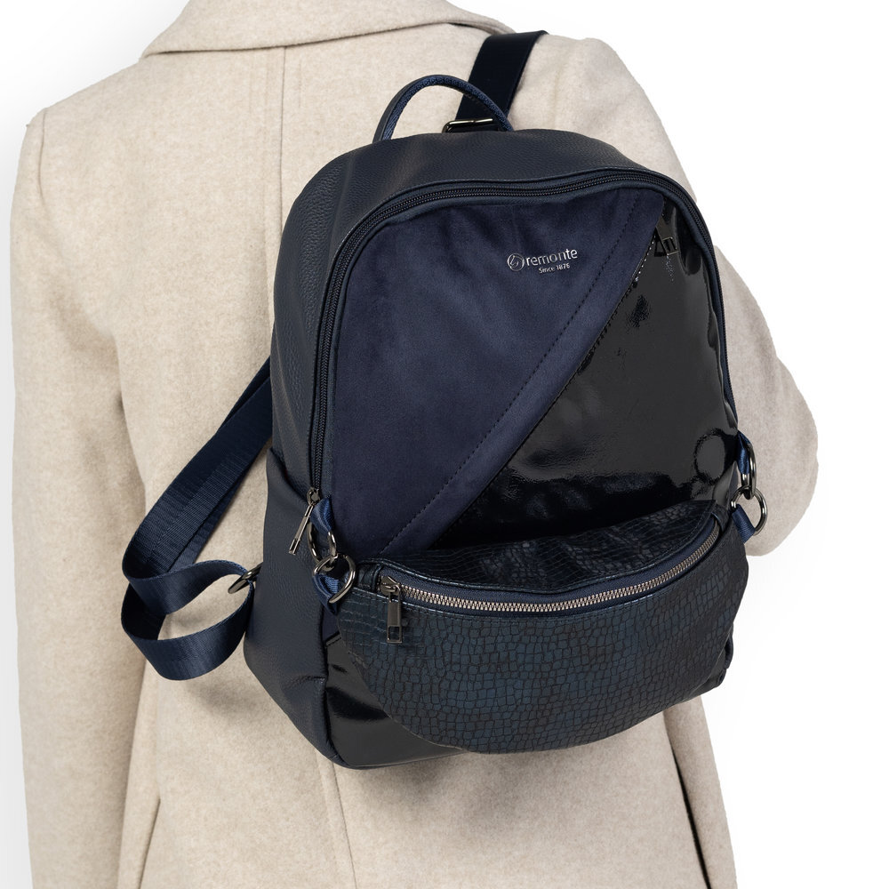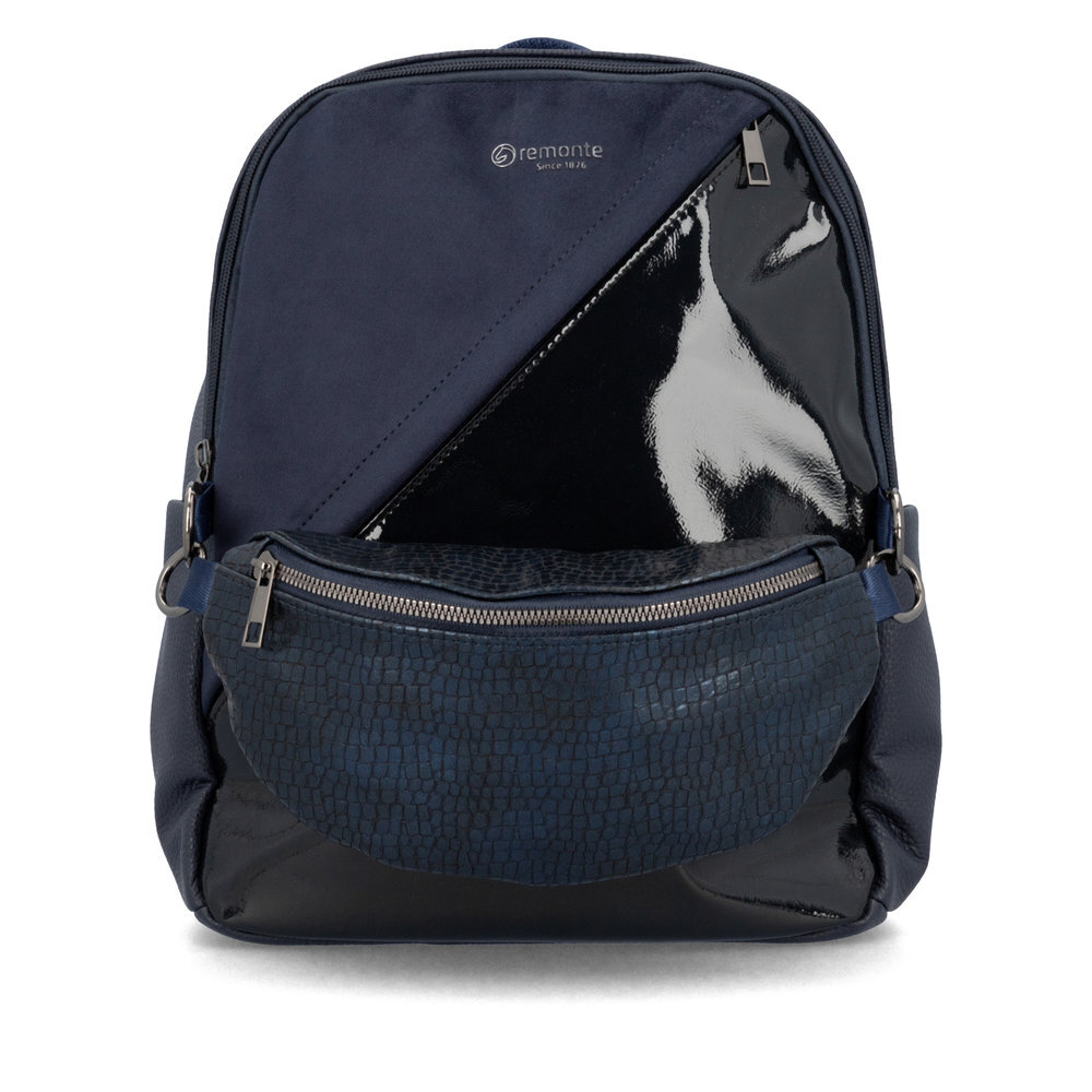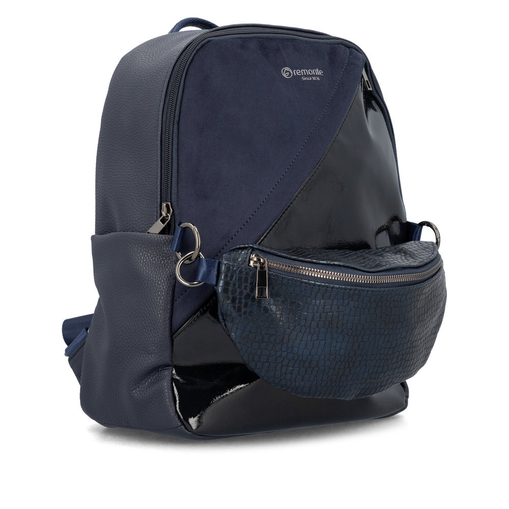 Originálny dámsky batoh z kolekcie značky Remonte by Rieker. S prehľadom sa Vám do neho zmestia každodenné potreby. Stredná veľkosť - do batohu sa zmestí formát A4, kovanie vo farbe ocele. Na prednej strane šikmé zipsové vrecko a odopínateľná ľadvinka, na zadnej strane zipsové vrecko a pútko na cestovný kufor, na bokoch malé otvorené vrecká, zhora zipsový uzáver. Vnútorná výbava 1x zipsové vrecko na cennosti, 2x otvorené vrecko na mobil, kľúče a pod. Spevnené dno, látkové ramenné popruhy s dĺžkovou reguláciou, odopínateľný ramenný/crossbody popruh s dĺžkovou reguláciou 75-135 cm, pútko do ruky alebo na zavesenie. Rozmery cca stredná šírka 26 cm, výška 35 cm, dno má hĺbku 12,5 cm.