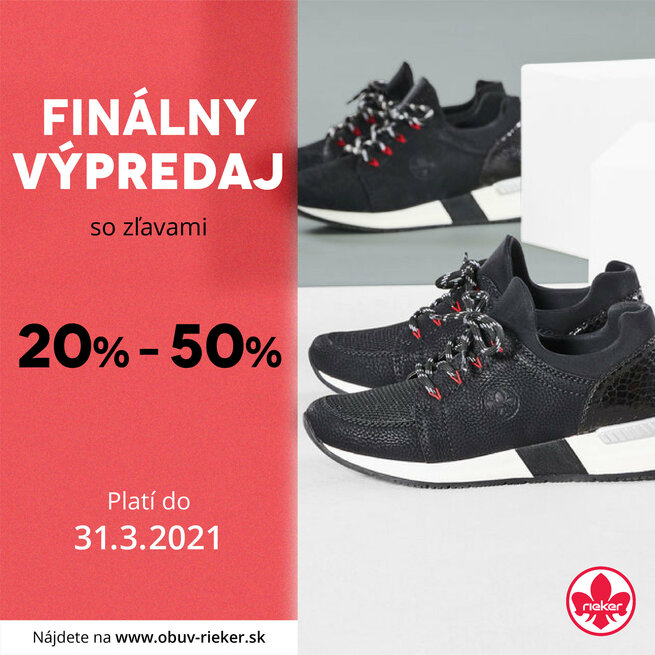 Nepremeškajte finálny výpredaj zimných aj celoročných modelov so zľavou až do 30% značky Rieker, doplnený o nové modely a nakupujte značkové topánky za ešte nižšie ceny! Vo výpredaji nájdete aj obľúbené dámske a pánske topánky všetkých typov so zľavou až 50%.