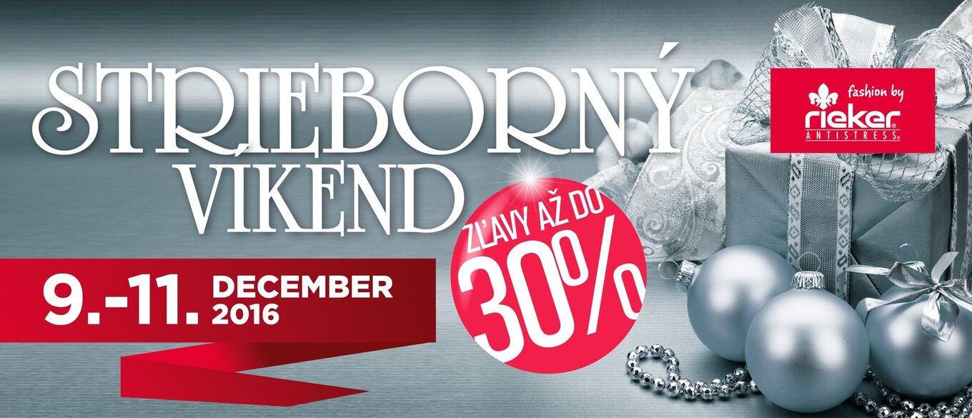 Vianoce už klopú na dvere! Nakupujte počas Strieborného víkendu 9.-11.12.2016 vaše obľúbené topánky so zľavou až do 30%. Najširšiu kolekciu značky Rieker nájdete v našom eshope.