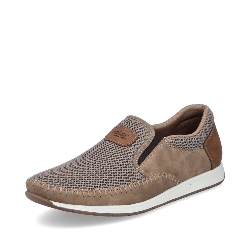 Pánske mokasíny z kolekcie značky Rieker. Priestorný strih. Zvršok je z priedušného materiálu, ktorý zaručuje pohodlie a komfort aj počas letných horúcich dní. Sú vybavené vsadenými gumičkami pre pohodlné vyzúvanie a obúvanie. Pohodlná, ľahká konštrukcia s mäkkou stielkou zaistí príjemnú chôdzu, rovnako ako aj ohybná podošva. Vďaka jej vlastnostiam je táto obuv vyhľadávaná všetkými, ktorí musia počas dňa dlho stáť a chodiť. Pružná podošva dokonale dopĺňa športový dizajn, postará sa o Vaše pohodlie na každom kroku, tlmí nárazy a otrasy. Ak denne trávite na nohách viac času tak značka Rieker je skutočne tou pravou voľbou pre Vás. Ide doslova o vychádzkovú obuv ktorá vydrží v plnej kvalite naozaj veľmi dlhý čas. Po vyčerpávajúcom a náročnom dni sa budú Vaše nohy cítiť svieže a oddýchnuté a to najmä vďaka ľahkým materiálom.