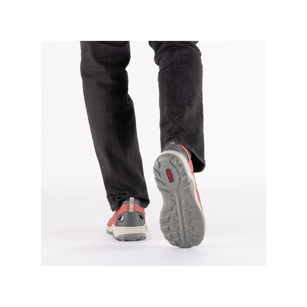 Pánske športové sandále z kolekcie značky Rieker. Dizajnová podošva sa postará o Vaše pohodlie na každom kroku. Tento model oceníte pri ceste do práce, ale aj pri bežných pochôdzkach. Pružná podošva dokonale dopĺňa športový dizajn, postará sa o Vaše pohodlie na každom kroku, tlmí nárazy a otrasy. Vďaka jej vlastnostiam je táto obuv vyhľadávaná všetkými, ktorí musia počas dňa dlho stáť a chodiť. Ak denne trávite na nohách viac času tak značka Rieker je skutočne tou pravou voľbou pre Vás. Ide doslova o vychádzkovú obuv ktorá vydrží v plnej kvalite naozaj veľmi dlhý čas. Po vyčerpávajúcom a náročnom dni sa budú Vaše nohy cítiť svieže a oddýchnuté a to najmä vďaka ľahkým materiálom.
